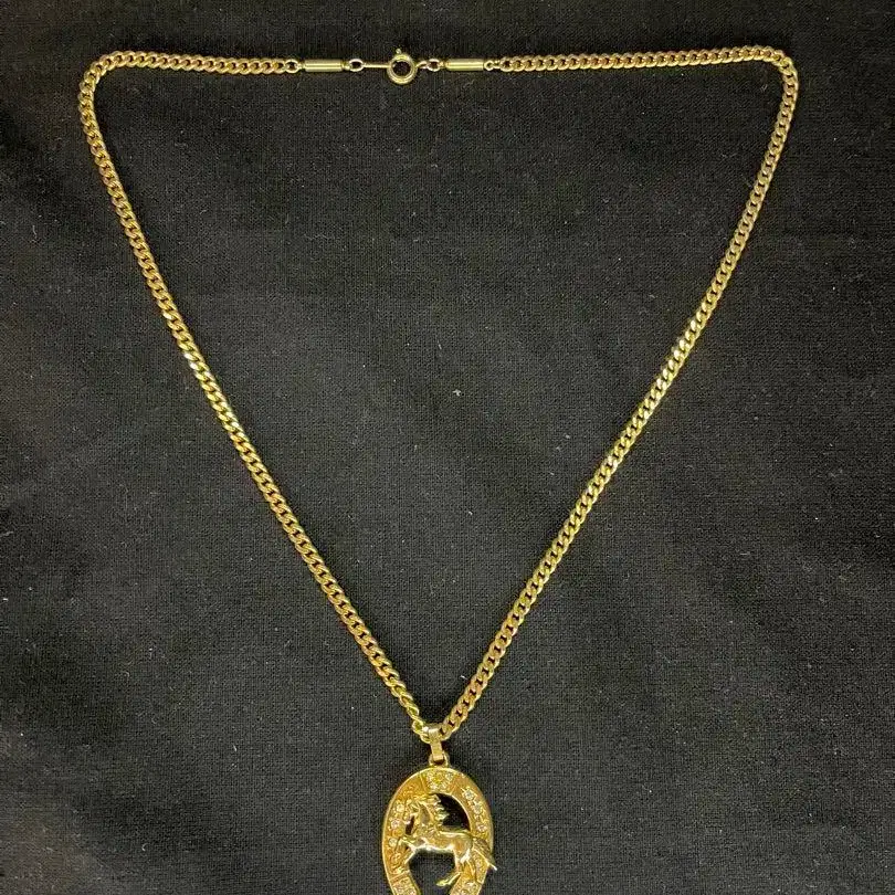 말 모티브가 특징인 골드 목걸이. - 색상: 골드 - 디자인: 말 모티브, 장식적인 디테일 - 체인 스타일: 링크 체인 - 펜던트 모양: 말발굽 모양 - 장식: 스톤 장식 - 길이: 표준적인 목걸이 길이 방문해 주셔서 감사합니다. 상태는 사진을 확인해 주세요.