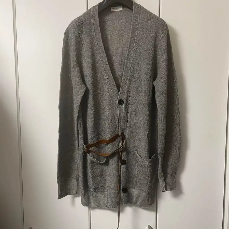 DRIES VAN NOTEN 가디건입니다. 색상은 그레이, 사이즈는 S입니다. 브라운 가죽 벨트가 포함되어 있습니다. 데미지 가공이 되어 있습니다. 잡지 '맨즈 논노'에서 기무라 타쿠야 씨가 착용했습니다. 착용 횟수가 적고, 새상품급입니다.