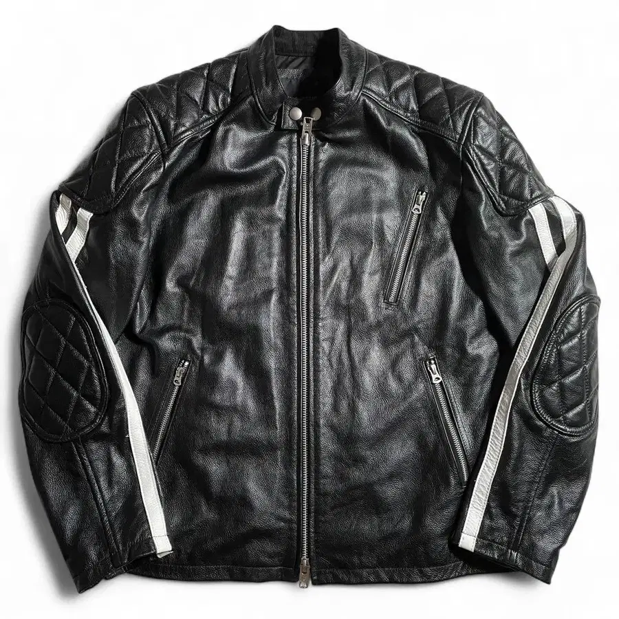 어깨와 팔꿈치에 패드와 소매에 트윈 스트라이프가 특징인 가죽 자켓입니다. 가죽은 주름이 있고 비교적 부드러워 입기 편한 타입입니다.