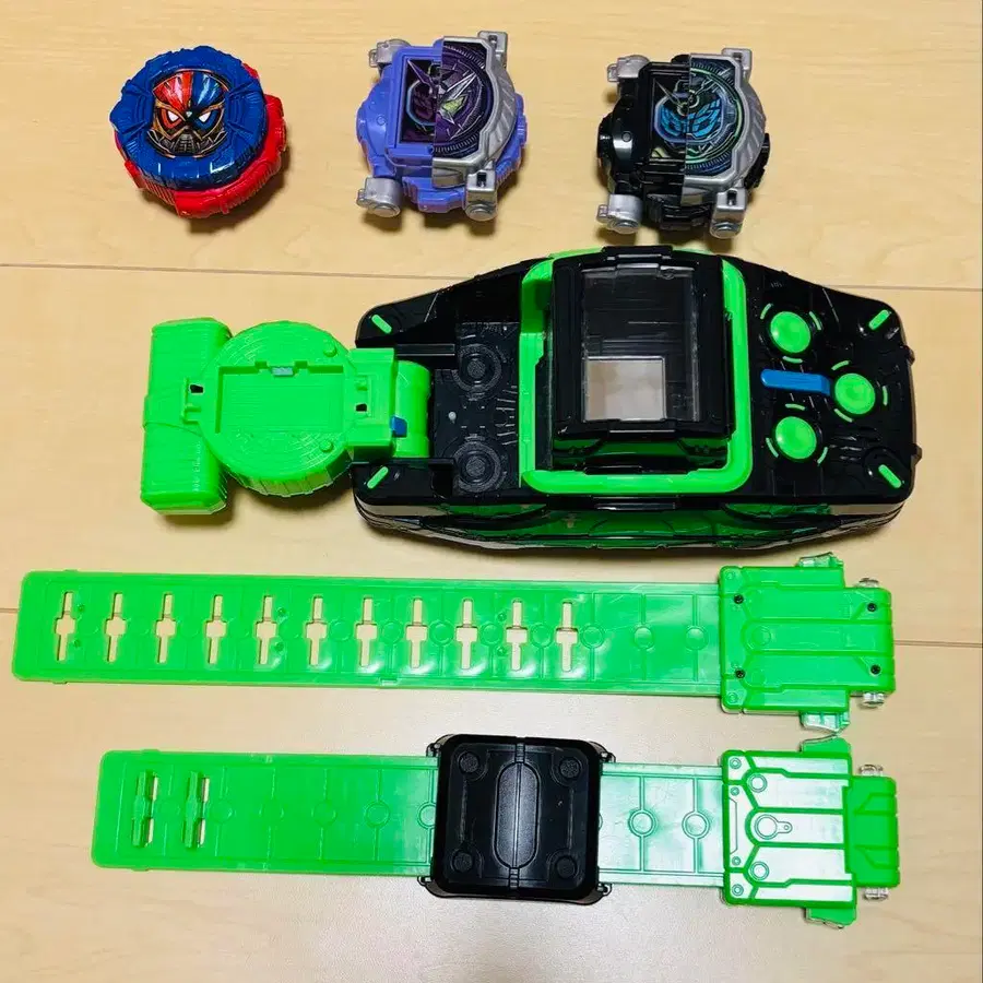 벨트와 아이템 3개 포함 사진 가운데와 오른쪽 물건은 덮개가 한쪽 없습니다. 본체 동작 확인 완료. 배터리 잔량은 알 수 없으나 넣어두겠습니다. 어린이가 가지고 놀던 것이므로, 중고품임을 이해하시는 분만 잘 부탁드립니다. 반품 불가. 방문해 주셔서 감사합니다.