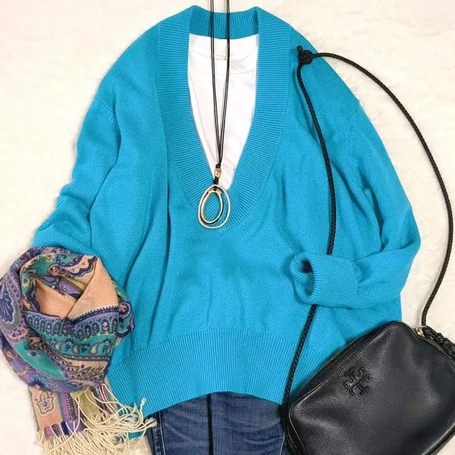 새상품급 드로어 캐시미어 100% V넥 니트 천축 편직 터콰이즈 블루