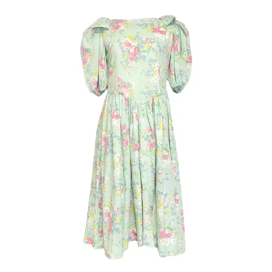 민트 그린 꽃무늬 퍼프 슬리브 디자인의 미디 기장 원피스.