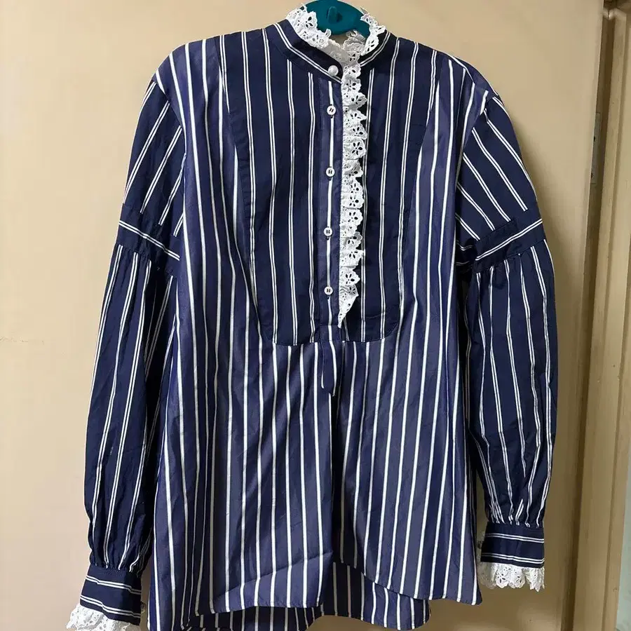 네이비와 화이트 스트라이프, 레이스 카라 부착 긴팔 블라우스. - 색상: 네이비와 화이트 스트라이프 - 디자인: 레이스 옷깃과 버튼 부착 - 소매 스타일: 긴팔, 벌룬 슬리브 - 장식: 프론트에 레이스 트리밍 사이즈 40