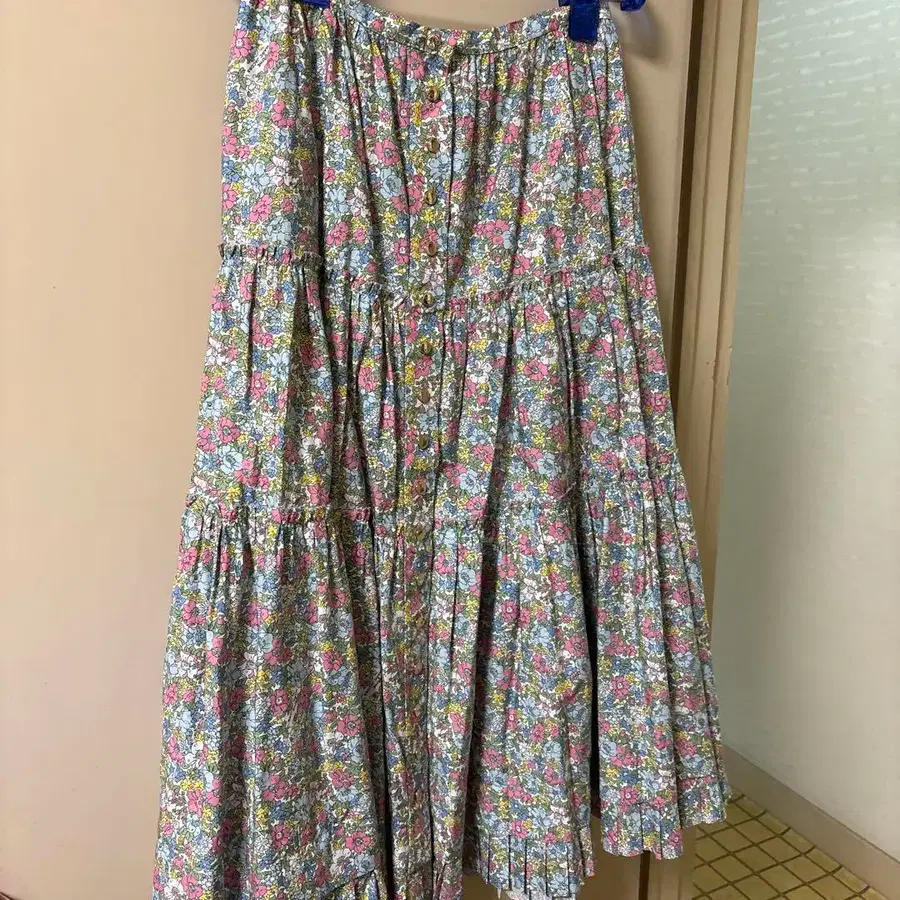 화려한 꽃무늬 버튼 플레어 스커트. - 색상: 꽃무늬 (핑크, 파랑, 옐로우 컬러) - 디자인: 버튼 플레어 스커트 코튼 100%, 사이즈 2