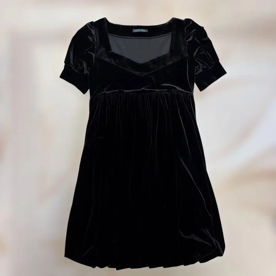 자동 번역되었어요. 원문보기스퀘어 넥과 퍼프 슬리브의 블랙 벨벳 원피스, 볼륨감 있는 실루엣이 특징.