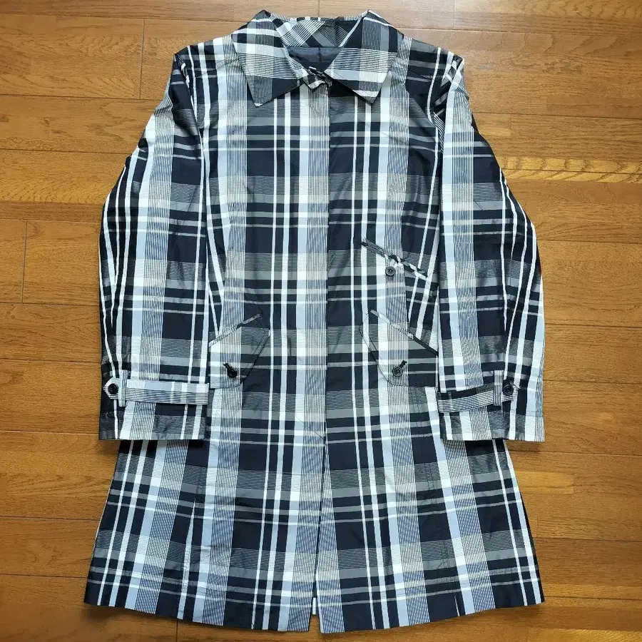 자동 번역되었어요. 원문보기블랙, 화이트, 그레이 체크 무늬 트렌치코트. 단추식과 허리 벨트가 있어 스타일리시합니다.