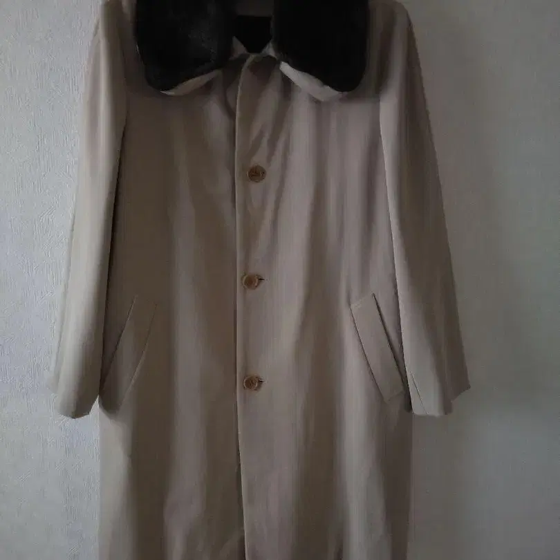 베이지 색상의 퍼 옷깃이 달린 라이너 포함 스텐카라 코트입니다.