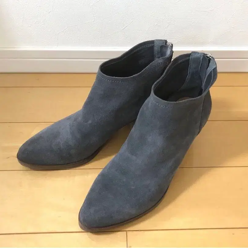 스웨이드 소재의 그레이 앵클부츠. 스틸레토 디자인으로 스타일리시합니다.