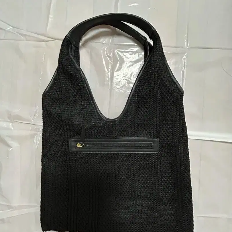 메쉬 소재의 블랙 토트백, 외부 포켓 부착으로 사용하기 편리합니다.