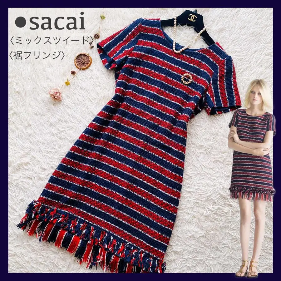 sacai 사카이 믹스 트위드 트리콜로 프렌지 집업 반팔 무릎 기장 원피스 일본제