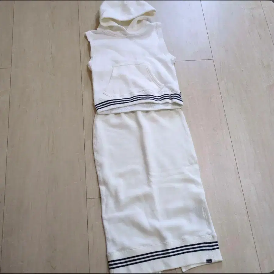 snidel의 맨투맨 원단 셋업입니다. 슬리브리스 후드티와 스커트입니다. 상하의 모두 속기모로 되어 있습니다. 프리 사이즈