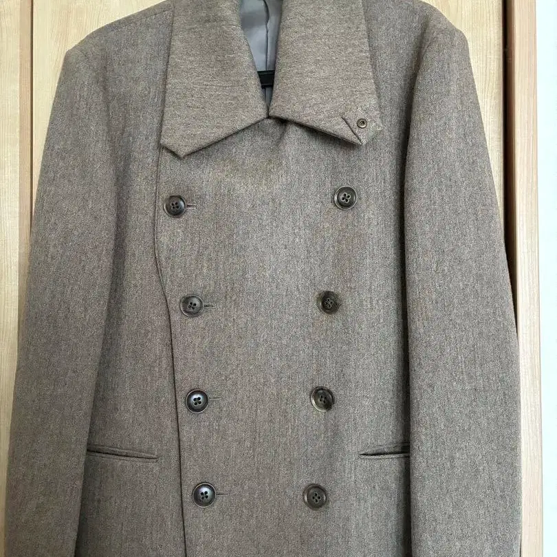 울 소재의 더블 브레스트 피 코트를 판매합니다. 옷깃은 2way 디자인으로, 스탠드 카라로 스타일리시합니다. - 색상: 브라운 계열 - 디자인: 더블 브레스트 - 소재: 울 - 특징: 뒷면에 장식적인 스티치 - 사이즈: 약 어깨 너비 45, 가슴 너비 50
