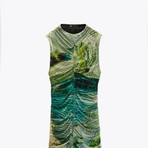 그린 계열의 프린트가 들어간 슬리브리스 튤 드레스. 미사용 새상품 - 디자인: 프린트된 튤 소재의 드레스 - 색상: 그린 계열의 색감 - 스타일: 슬리브리스 - 특징: 개더가 들어간 디자인 방문해 주셔서 감사합니다.