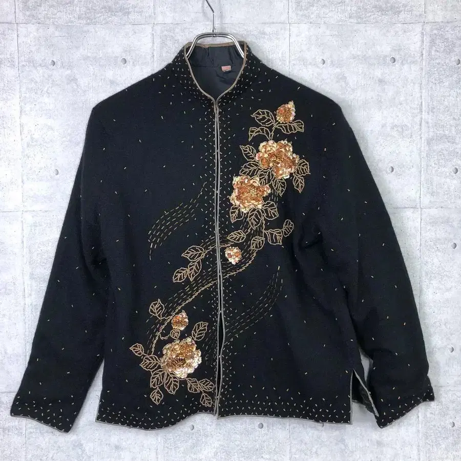 레트로 올드 60s 70s 동양인 오리엔탈 클래시컬 홍콩 구제 의류 꽃무늬 자수 비즈 포함 차이나 니트 자켓 가디건 44