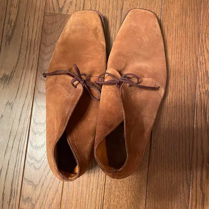 존 롭 브라운 스웨이드 소재, 스퀘어토 디자인의 신발.