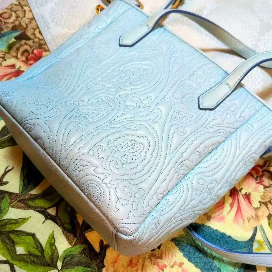 방문해 주셔서 감사합니다(^o^) 에트로 ETRO 올 패턴 페이즐리 핸드백 숄더백 토트백 2way 입니다. 컬러는 라이트 블루이며, 매우 아름다운 올 패턴이 고급스럽게 떠오르는 부드러운 양가죽으로 되어 있고, 손잡이와 숄더 부분은 소가죽입니다. 안쪽 원단은 선명한 핑크색이 악센트 컬러가 되어 있으며, 스웨이드처럼 보이는 폴리에스테르 원단입니다. 얼룩이나 오염 없이 포켓이 1개 있습니다. 숄더백으로도 토트백으로도 사용할 수 있으며, 손잡이에 데미지는 없습니다. 사이즈는 세로 20.5cm 가로 윗부분 27cm ~ 아랫부분 22cm 바닥 10cm 사용 횟수는 1~2회로 컨디션 최상이라고 생각합니다. 품질 표시와 더스트백, 사용 설명서를 함께 보내드리며 정성스러운 포장을 약속드립니다. 잘 부탁드립니다.