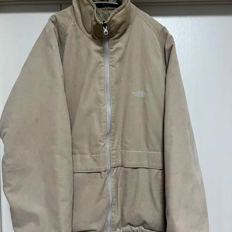 리버서블 코듀로이 소재의 베이지 다운 자켓, 풀 집업 디자인에 하이넥 사양. - 브랜드: THE NORTH FACE - 색상: 베이지 - 스타일: 다운 자켓 - 소재: 코듀로이 - 특징: 풀 집업, 하이넥 - 사이즈: 프리 사이즈 (밑단을 조일 수 있어 165cm ~ 185cm까지 착용 가능할 것으로 생각됩니다.)