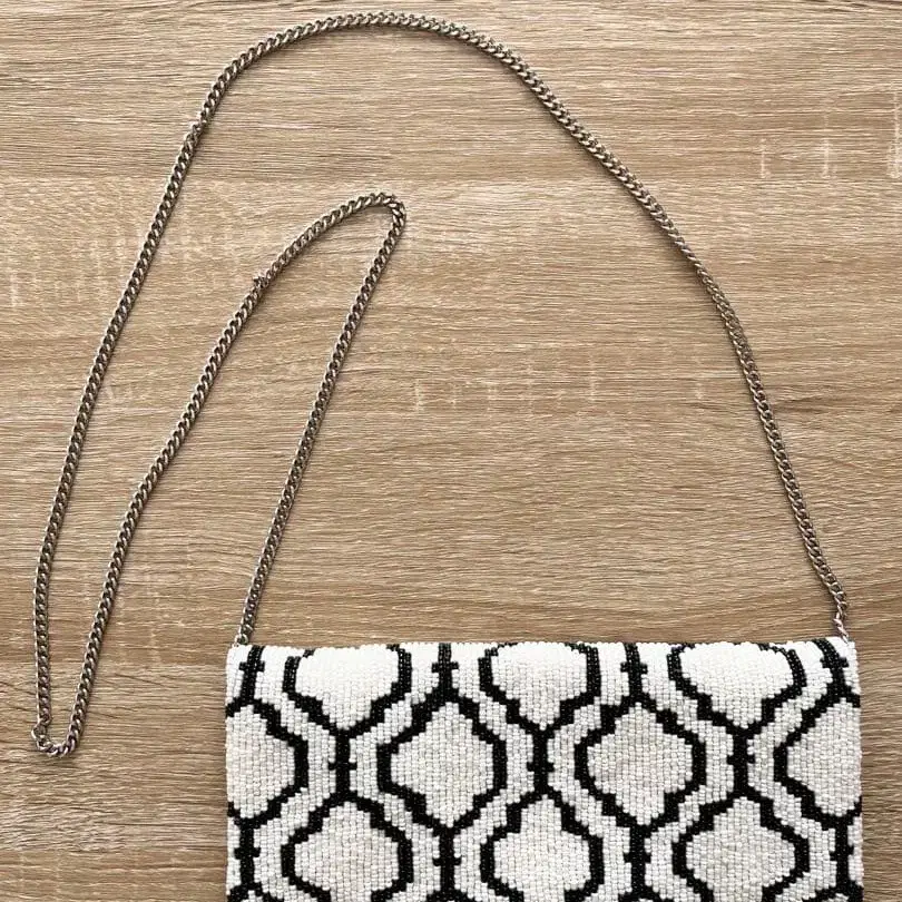 [ NINA BAGS ] 싱가포르 브랜드입니다. 화이트와 블랙 비즈로 만들어진 엘레강트한 클러치백. - 색상: 화이트와 블랙의 기하학 패턴 - 소재: 비즈 - 스타일: 클러치백 - 안쪽: 새틴 소재 안감 - 스트랩: 체인 스트랩 ※ 뒷면에 약간의 얼룩이 있으므로, 이해하신 분만 구매해 주세요. 방문해 주셔서 감사합니다.