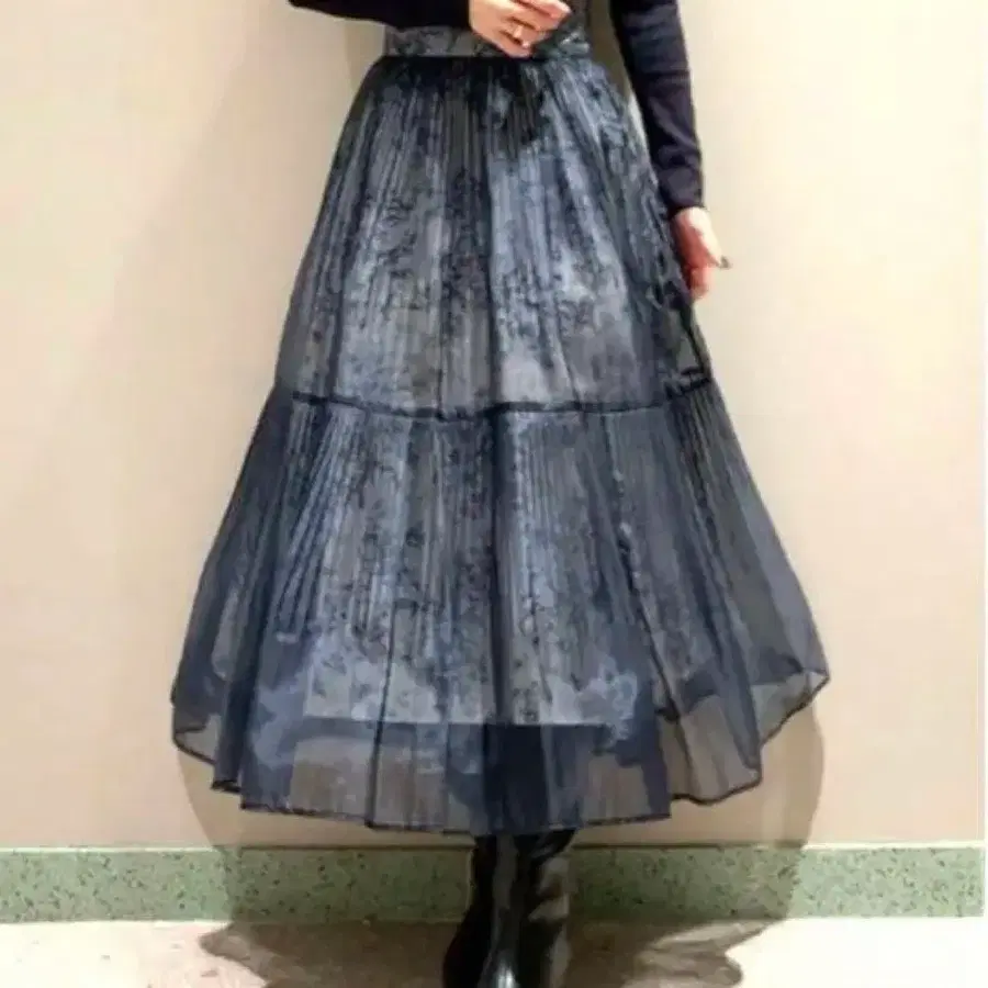 시스루 네이비 플리츠 롱 스커트, 엘레강트한 디자인으로 다양한 코디네이트에 최적.