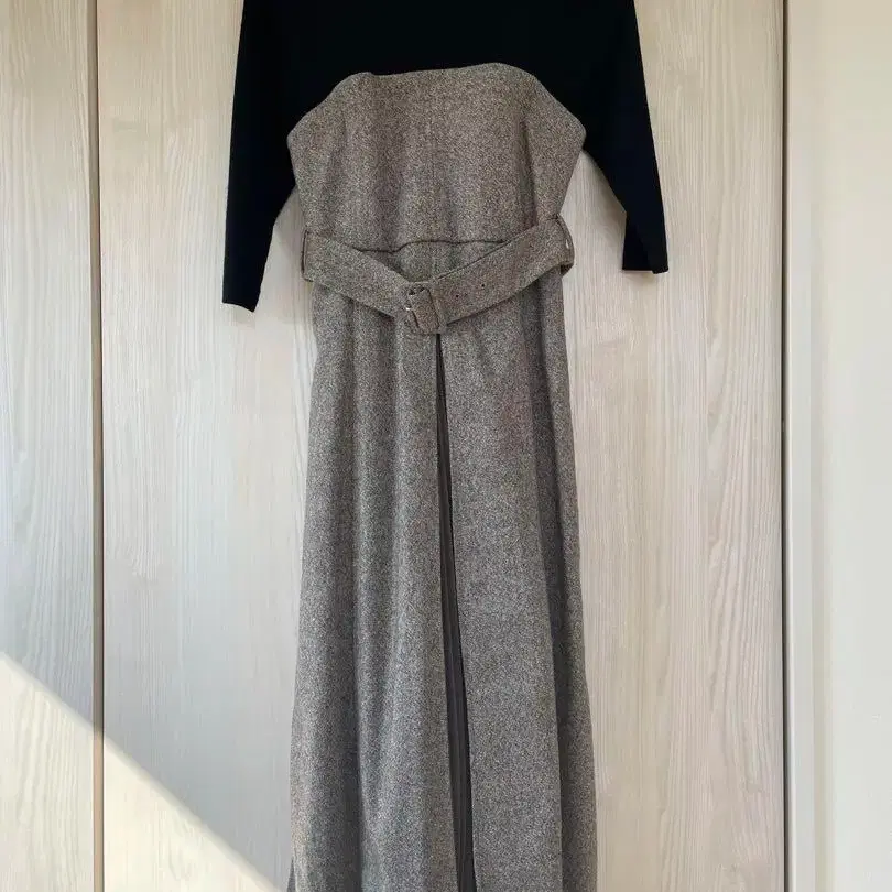 뷔스티에풍 디자인의 하이웨스트 트렌치 스커트에 스탠드넥 니트를 도킹한 한 장으로 시선을 사로잡는 원피스.