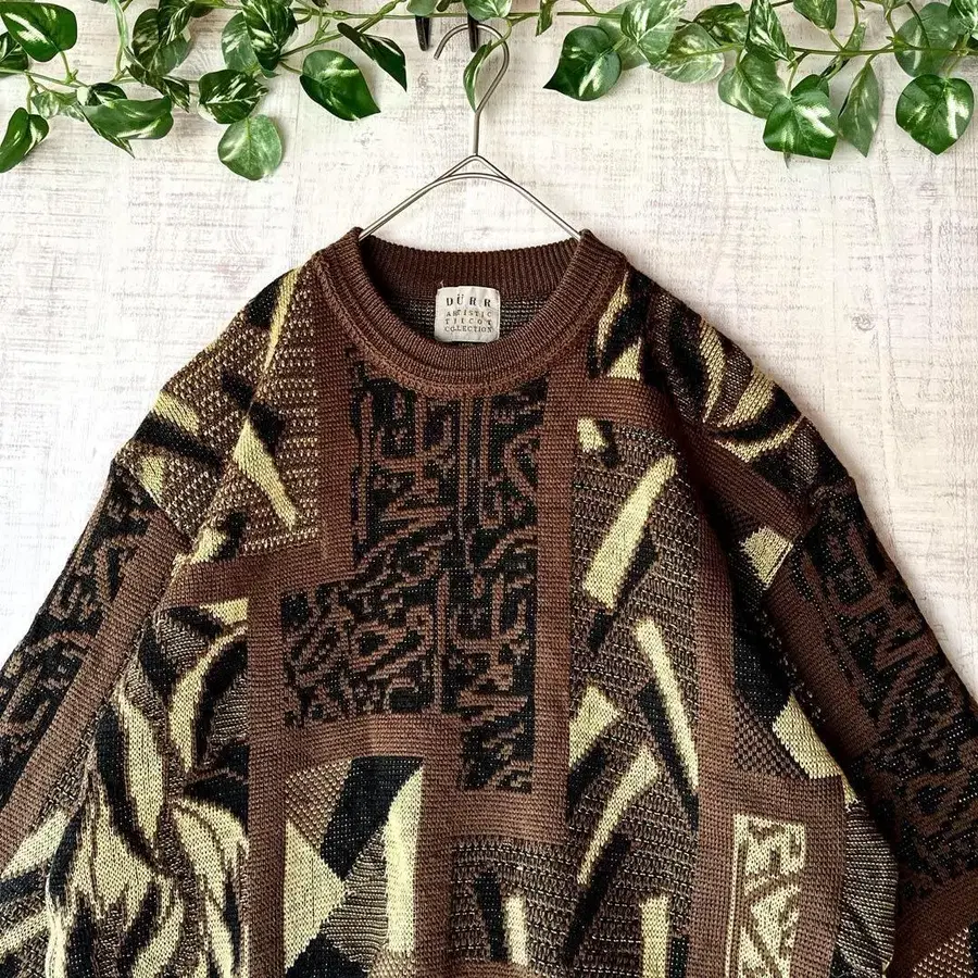 빈티지 패턴 니트 스웨터 어스 컬러 브라운 레트로 일본제 울 L