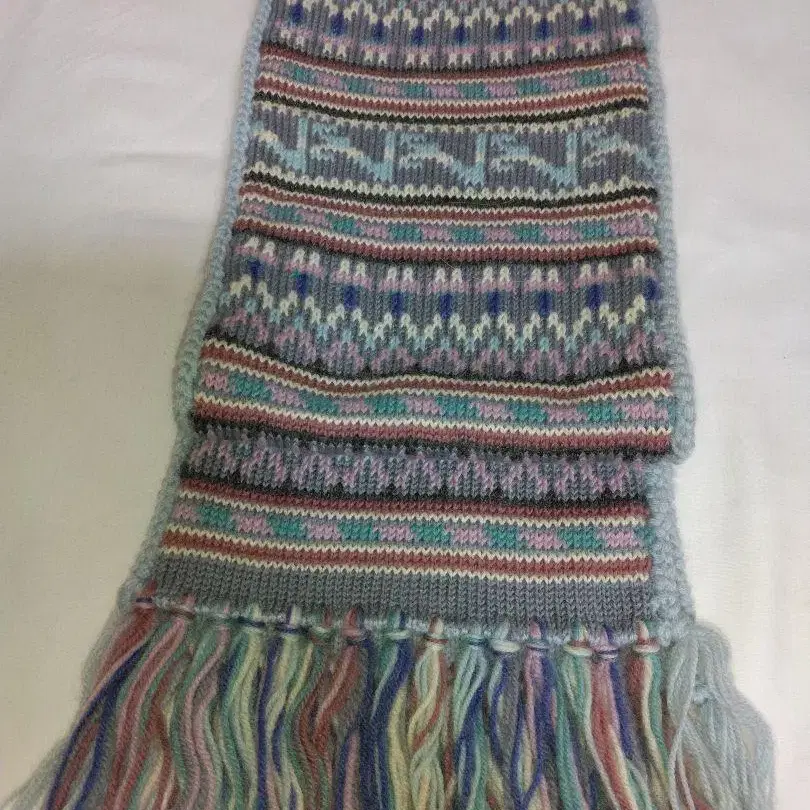다색의 페어아일 패턴이 특징인 울 혼방 이중 편직 머플러입니다.