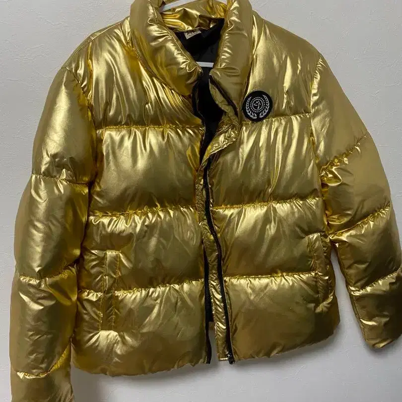 광택이 나는 골드 다운 자켓, WE AR 브랜드.
