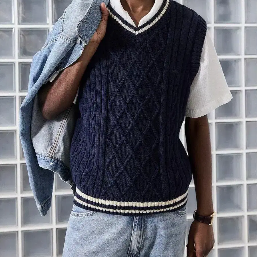 네이비 케이블 니트 베스트, 화이트 스트라이프 리브 포함, L 사이즈. - 브랜드: Urban Outfitters - 사이즈: L - 치수: 기장 61cm, 가슴 너비 58cm - 색상: 네이비 - 상태: 택 포함 미사용 새상품 - 판매처: Urban Outfitters 온라인