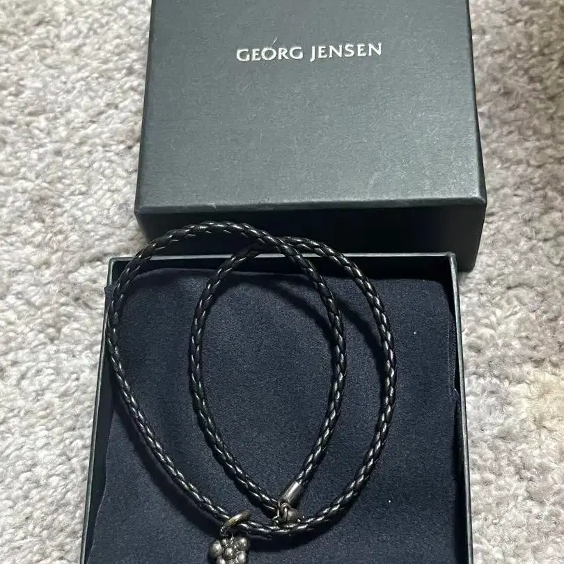 가죽 소재의 블랙 목걸이에 포도 참이 특징입니다. - 브랜드: GEORG JENSEN - 소재: 가죽 - 디자인: 포도 참 방문해 주셔서 감사합니다.