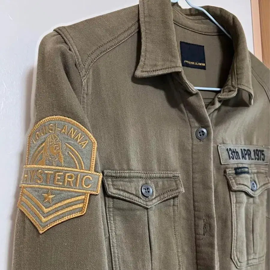 카키색 밀리터리 롱 셔츠에 자수 패치가 달린 스타일리시한 디자인입니다.