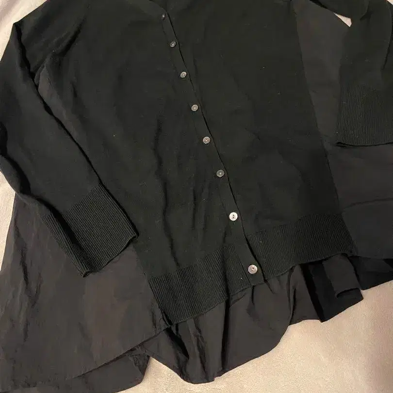 니트와 천의 콤비네이션으로, 밑단이 플레어인 버튼업 셔츠. - 색상: 블랙 - 스타일: 버튼업 - 소재: 니트와 천의 콤비네이션 - 디자인: 밑단이 플레어인 디자인 - 색상: 블랙 방문해 주셔서 감사합니다.