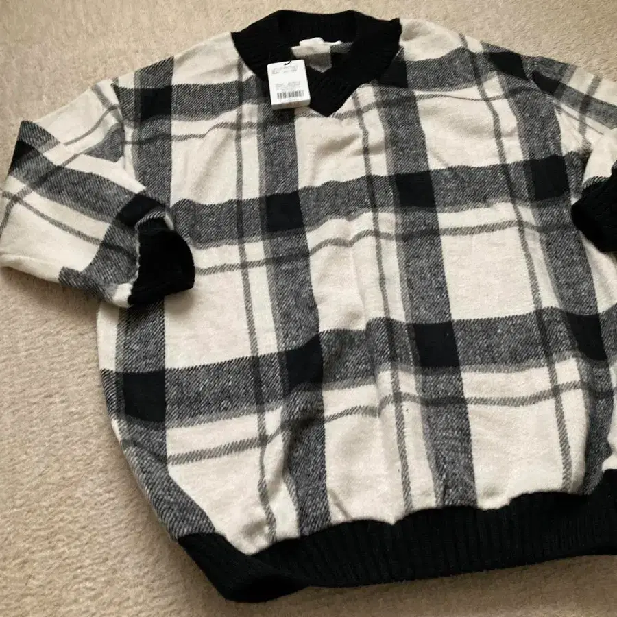체크 무늬 V넥 스웨터, 리브 소매와 밑단이 특징. - 디자인: 체크 무늬 - 색상: 화이트, 블랙, 그레이 - 넥 스타일: V넥 - 소매: 리브 - 밑단: 리브 방문해 주셔서 감사합니다. 평평하게 놓았을 때 총 기장 약 66cm 불분명한 점이 있다면 반드시 질문 부탁드립니다.