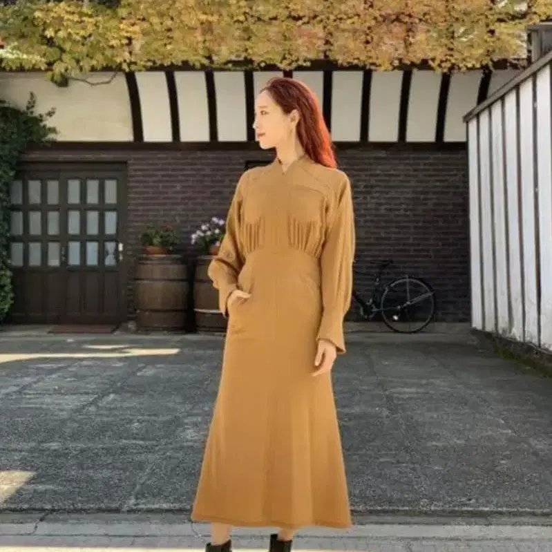 팔 둘레는 약간 넉넉하면서도 허리를 따라 흐르는 라인과 플레어 스커트의 아름다운 실루엣입니다.