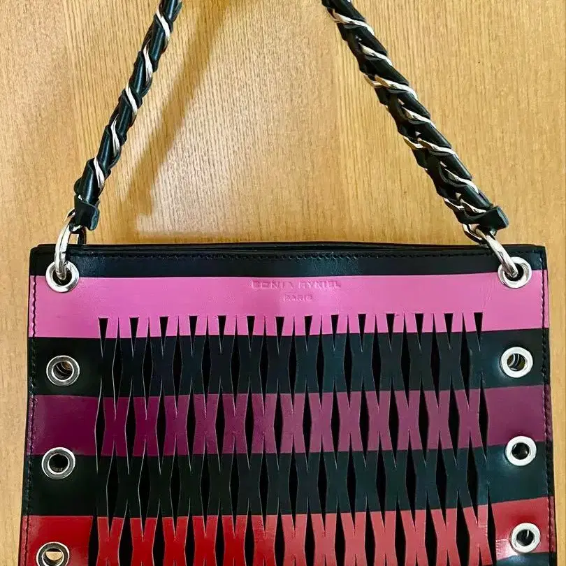 뜨개질 디자인의 컬러풀한 숄더백, 두 개의 컴파트먼트가 있습니다.