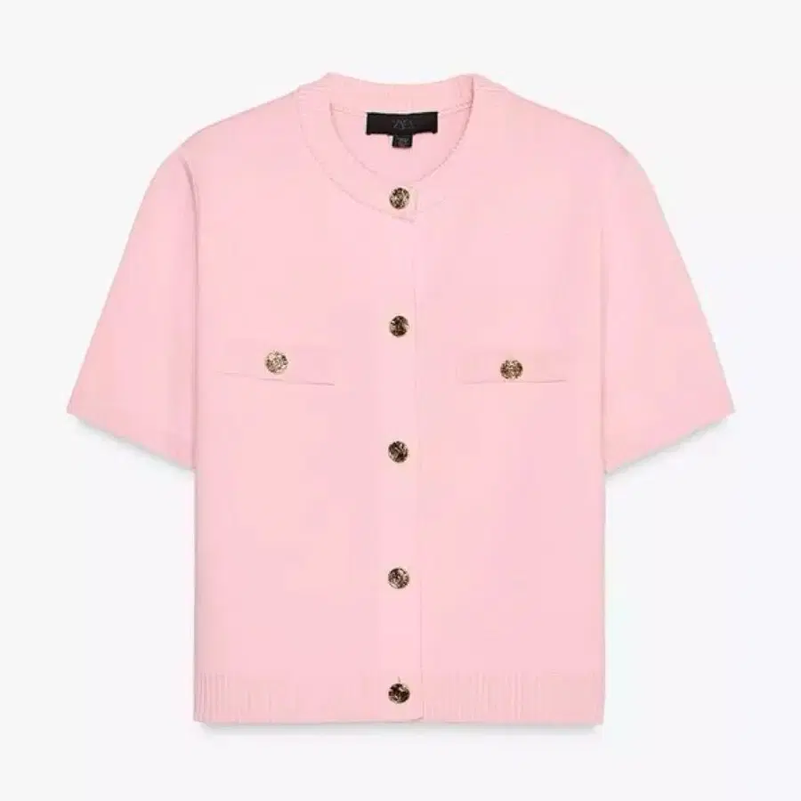 무지 니트 가디건, 크루넥, 숏 슬리브. 프론트는 골드 단추식