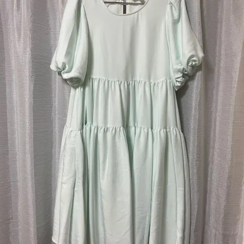 민트 그린 티어드 드레스, 벌룬 슬리브 디자인. - 브랜드: COS - 색상: 민트 그린 - 디자인: 티어드 드레스 - 소매 스타일: 벌룬 슬리브 - 백 스타일: 버튼이 있는 입구