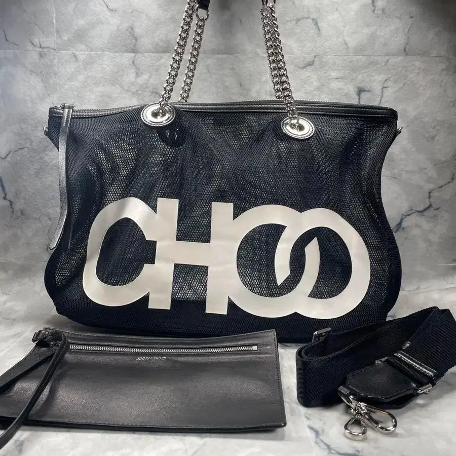 레어 새상품급 JIMMY CHOO 메쉬 토트백 파우치 숄더 포함