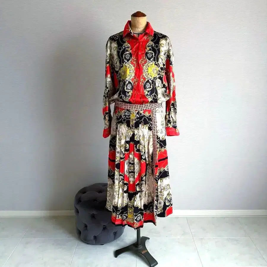 화려한 패턴의 셔츠와 스커트 세트업. 특히 마음에 들었던 세트입니다. 입어보니 생각했던 것 이상으로 정말 멋집니다. 셔츠 S 사이즈 기장 65, 총기장 50. 셔츠는 S 사이즈지만 L 사이즈인 사람이 입어도 딱 좋습니다. 스커트 L 사이즈 기장 80. - 색상: 빨간색, 블랙, 화이트, 금색 - 디자인: 패턴 제품, 버튼 달린 셔츠, 스커트 - 스타일: 캐주얼, 엘레강트 - 세트 내용: 셔츠와 스커트 세트 - 특징: 허리에 벨트 포함 방문해 주셔서 감사합니다.
