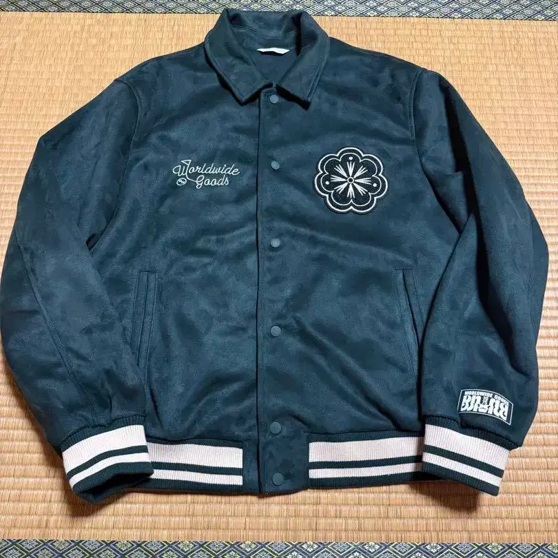 다크 그린 색상의 스웨이드 느낌 바시티 자켓입니다. 자수 디자인과 리브가 있는 밑단이 특징입니다. - 브랜드: ZARA - 디자인: 자수 포함 - 색상: 다크 그린 - 특징: 리브가 있는 밑단 - 스타일: 바시티 자켓 - 포켓: 사이드 포켓 있음 - 사이즈: XL 약 1년 전에 시부야 ZARA에서 구매했습니다.