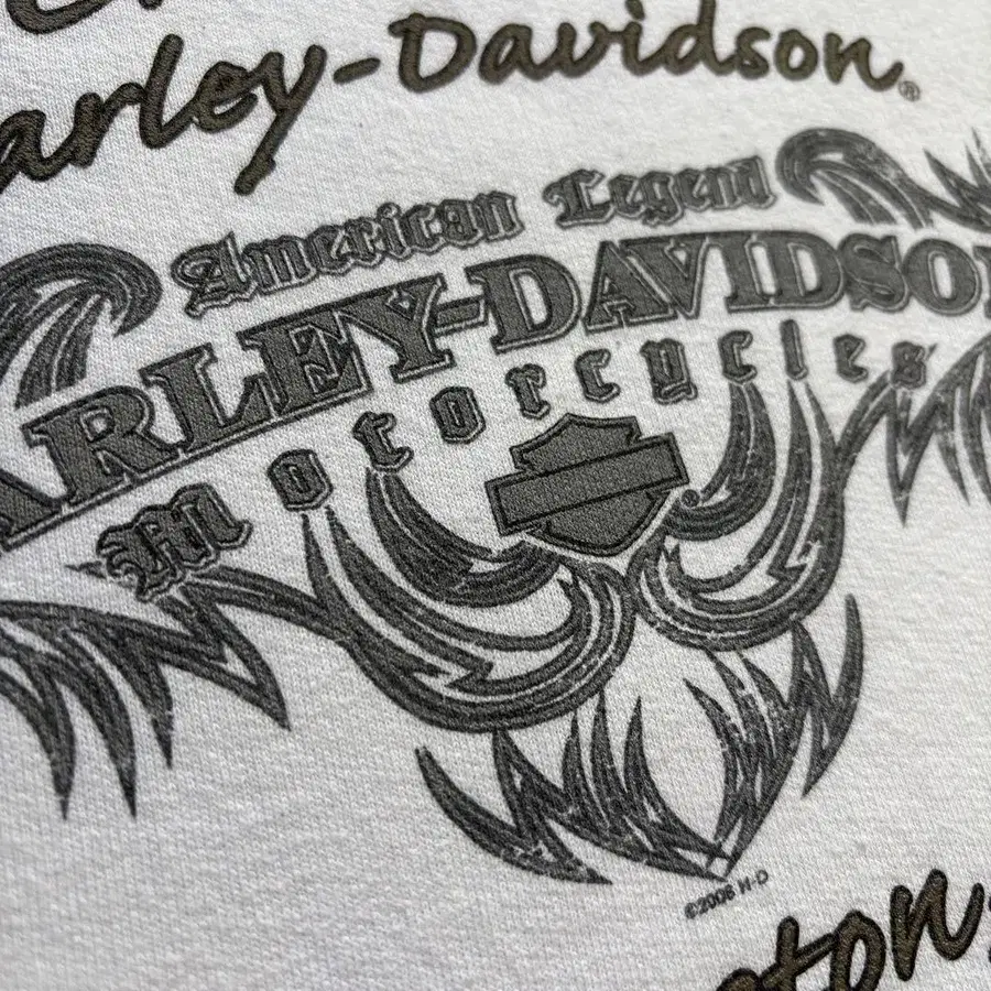 프론트에는 흑백 컬러의 스테디셀러 로고와 블랙 레터 스타일의 할리 글자 프린트, 백 프린트에도 할리 글자 프린트가 있습니다.