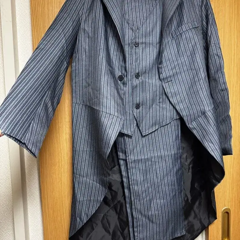 방문해 주셔서 감사합니다. 스트라이프 디자인의 롱 자켓 턱시도입니다. - 색상: 스트라이프 (푸른빛이 도는 그레이) - 스타일: 턱시도 자켓, 베스트, 팬츠 3종 세트입니다.
