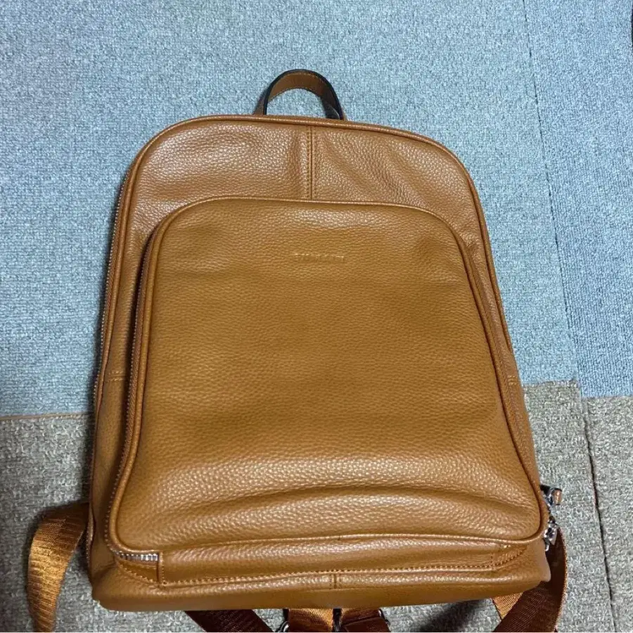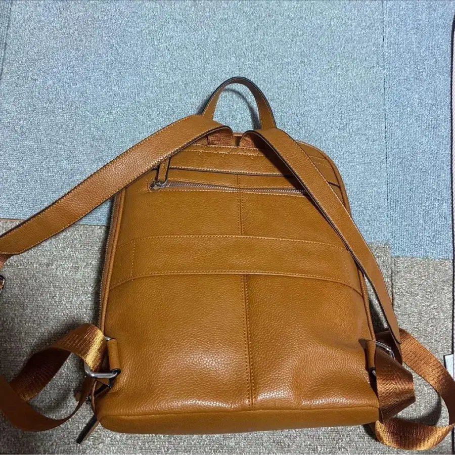 심플한 디자인의 브라운 가죽 백팩, 내부에 여러 개의 포켓이 있습니다.