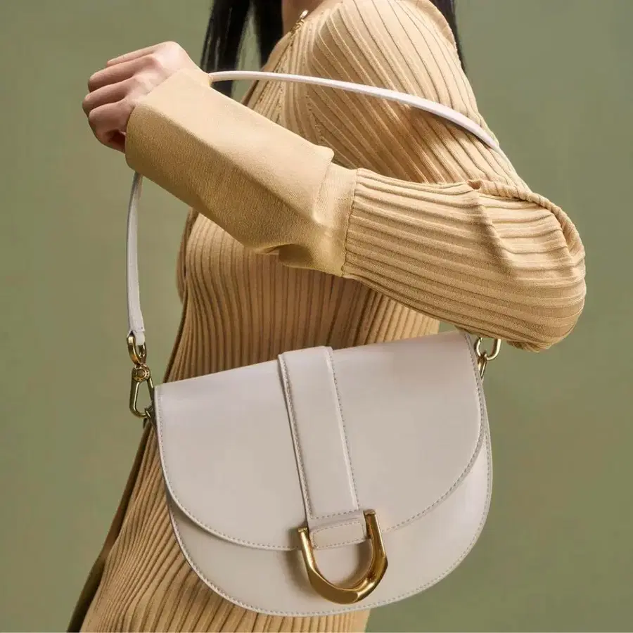 고급스러운 가죽 느낌의 소재를 하프문 실루엣으로 표현했으며, 플랩에는 큰 메탈릭 부품을 대담하게 배치했습니다.