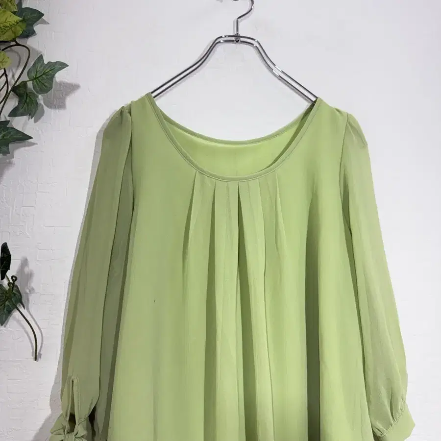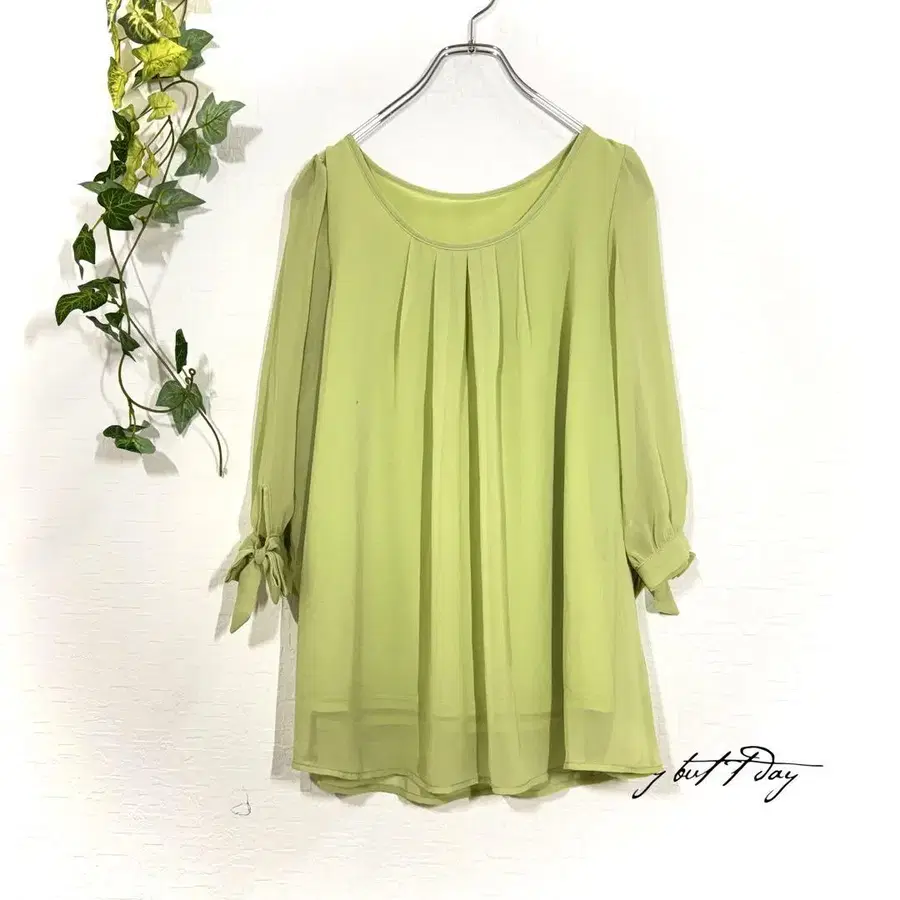 Raffia Blu의 쉬폰 튜닉 블라우스. 상큼한 라임 그린 (옐로우 그린색)과 소매의 입체적인 리본 디자인이 여성스러움을 돋보이게 하는 [시스루 상의]. 안감이 있어 너무 비치지 않아 안심할 수 있습니다. 풍성한 개더와 플레어 실루엣으로 체형 커버도 가능한 [깔끔한 블라우스]입니다.