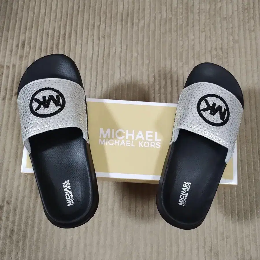 실버 로고 디자인이 특징인 슬라이드 샌들. - 브랜드: MICHAEL MICHAEL KORS - 색상: 실버/블랙 - 스타일: 슬라이드 샌들 - 밑창: 러버 솔 사이즈를 잘못 구매하여 새 상품입니다. 방문해 주셔서 감사합니다.