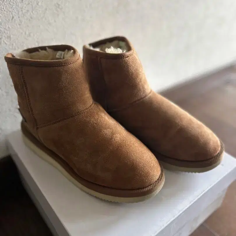 SUICOKE 숏 무스탕 부츠 소재: 소가죽, 나일론, 무스탕 (어퍼), 러버 (밑창) 사이즈: 6 (24cm) 색상: 브라운 밑창 높이: 약 3cm 가격: 30,800엔 (세금 포함) 2년 전 나카메구로 셀렉샵에서 구매했습니다. 착용감이 좋고, 뒷부분 지퍼로 되어 있어 흐물거리지 않고 형태가 유지됩니다. 브라운 색상도 차분해서 코디하기 좋습니다. 사이즈는 24cm이며, 평소 23.5cm인 제가 양말을 신고 신었을 때 딱 맞는 사이즈감입니다. 마음에 들지만, 자주 신을 기회가 없어 사용 횟수는 5회 정도입니다. 밑창은 뒤꿈치 부분이 얇게 닳았지만, 전반적으로 매우 깨끗한 상태입니다. 깨끗한 상태이므로 마음에 드시는 분께 신으셨으면 좋겠습니다. 발송 시 상자도 있어, 집에 있는 재활용 포장재로 포장하여 보내드리겠습니다. 궁금한 점이 있으시면 사소한 것이라도 댓글 부탁드립니다. NC, NR로 기분 좋은 거래를 지향합니다. 아래↓상품 설명 가을/겨울 스테디셀러 무스탕 숏부츠 모델, [ELS]. 무스탕 한 장으로 완성한 SUICOKE (스이코크) 스테디셀러 모델입니다. SUICOKE 오리지널 밑창을 채용하여 경량성, 굴곡성, 충격 흡수성, 내마모성 등이 뛰어나 장시간 보행에도 쾌적하게 사용하실 수 있습니다. 매우 따뜻하고 착용감도 뛰어납니다. 일본인의 발 모양에 맞춰 설계된 쿠션성이 뛰어난 풋베드에는 항균 기능이 배합되어 있습니다. 신경 쓰이는 냄새도 억제해주므로 맨발로도 착용 가능합니다. 또한, 뒷부분은 탈착이 편리한 지퍼 사양으로, 쉽게 신고 벗으실 수 있습니다. 쾌적한 핏감과 착용감을 실현한 무스탕 부츠입니다.