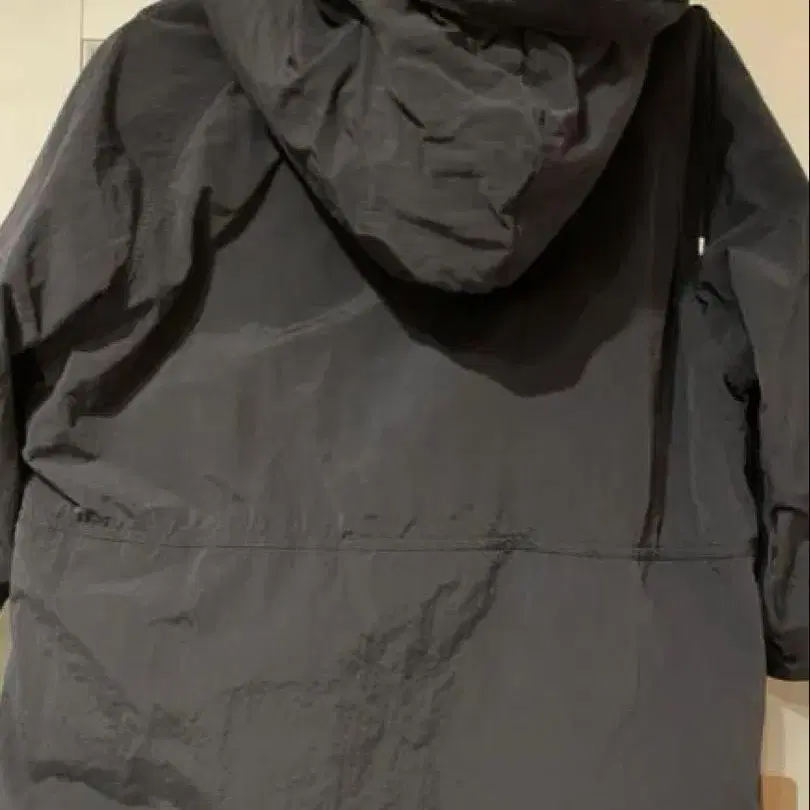 후드 부착 캐주얼 블랙 다운 자켓, 나일론 소재로 경량.