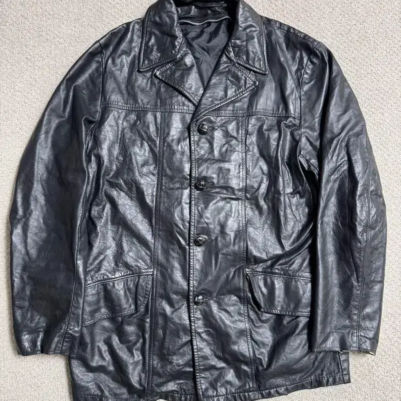 이 시대 특유의 약간은 어설픈 페타페타한 가죽이지만 부드럽고, 매트한 질감의 블랙 컬러가 매우 분위기 있는 카 코트입니다.