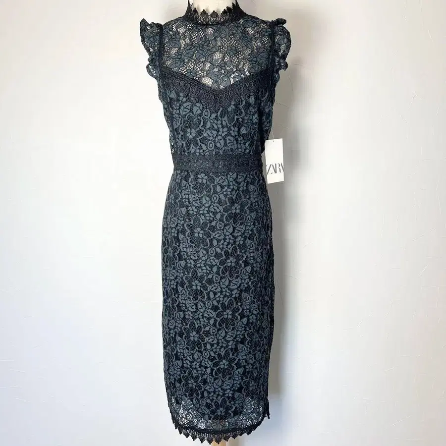 ZARA의 택 포함 새상품, 블루 그레이 색상 위에 블랙 색상의 전체 레이스가 겹쳐진 고급스럽고 화려한 하이넥 드레스입니다. 결혼식이나 2차 모임, 파티에 최적인 포멀 원피스입니다.