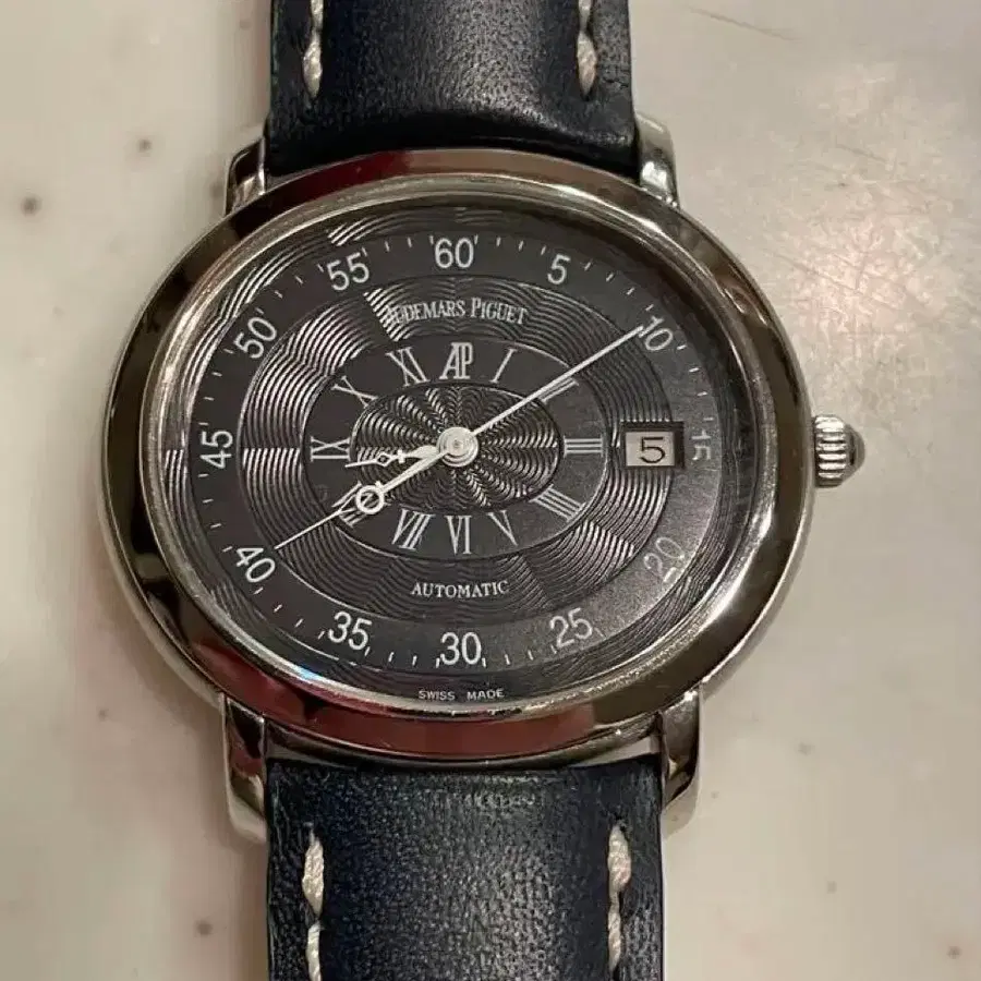 오데마 피게의 밀레니얼, 블랙 다이얼의 자동 와인딩 시계. - 브랜드: 오데마 피게 - 모델명: 밀레니얼 - 다이얼: 블랙 - 스트랩: 정품 가죽 (다크 블루) - 비죠: 정품 - 기능: 자동 와인딩 - 특징: 날짜 표시 - 부속품 있음 방문해 주셔서 감사합니다.